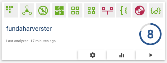 Om eens te kijken hoe deze tool exact werkte, pushte ik mijn funda-harvester naar mijn github account en ging naar bettercodehub, waar ik hem onmiddellijk tussen mijn andere repositories zag staan. Om de code te analyseren hoefde ik alleen maar op het pijltje rechtsonder te klikken. Nadat ik de standaardconfiguratie had geselecteerd werd er een kloon gemaakt van de repo, die werd geanalyseerd en tenslotte weer verwijderd. Het totale proces duurde ongeveer een halve minuut (nu is die harvester niet heel groot, een kleine duizend regels code, maar evengoed is dit behoorlijk snel).